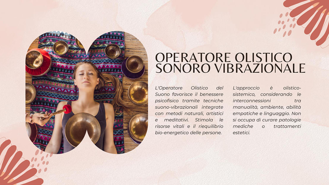 L’Operatore Olistico del Suono specializzato in Tecniche Suono-Vibrazionali favorisce nelle persone e nei gruppi il riequilibrio energetico, il benessere psicofisico e interiore attraverso l’utilizzo integrato di tecniche suono-vibrazionali e manuali, metodiche naturali, energetiche, artistiche e meditative.
