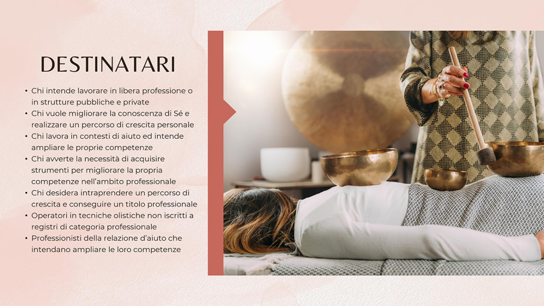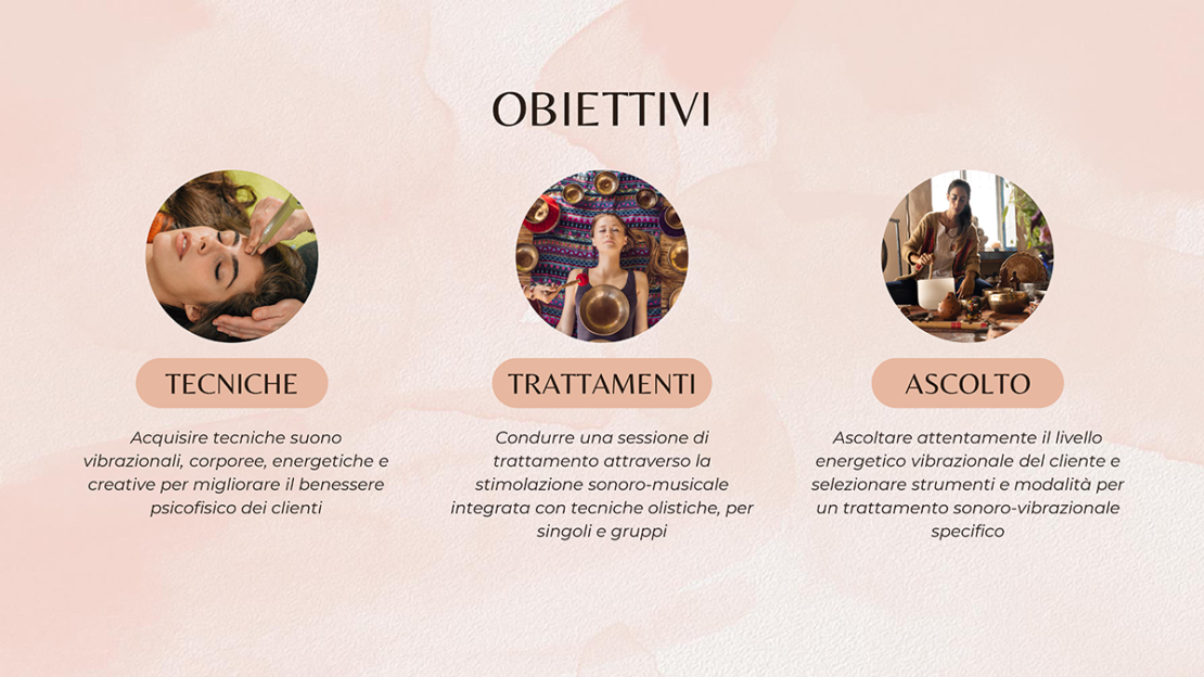 · Acquisire tecniche suono vibrazionali, corporee, energetiche e creative per supportare il cliente nel miglioramento del proprio benessere psicofisico.