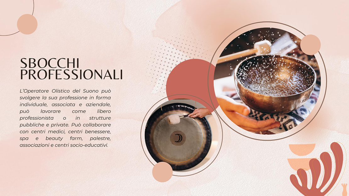 - L’Operatore Olistico del Suono può svolgere la sua professione in forma individuale, associata e aziendale, può lavorare come libero professionista o in strutture pubbliche e private che si avvalgono dell’aiuto di questa figura professionale.